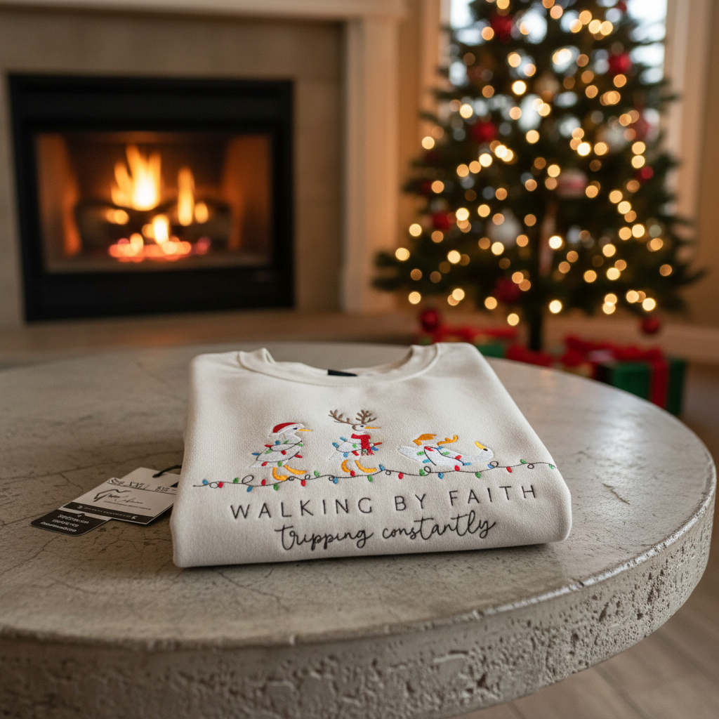 Faith isn’t about perfection—it’s about perseverance. Our custom embroidered sweatshirt captures that truth with a playful, relatable design: “Walking by Faith, Tripping Constantly.” This cozy piece is a reminder that grace meets us even when we stumble.